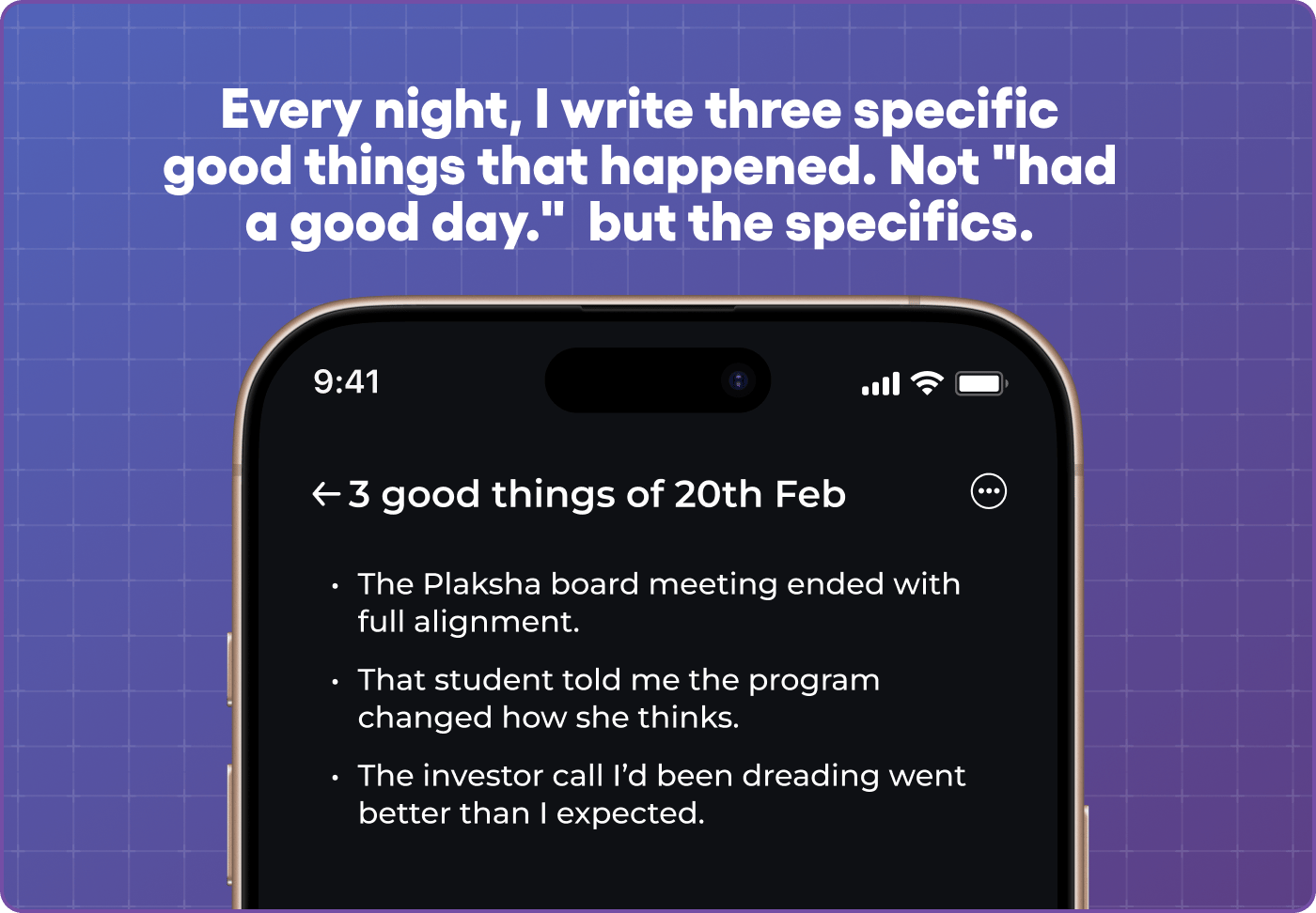 Baumeister’s research shows positive experiences fade unless they’re recorded with detail. Vague positives disappear. Specific ones stay. So I write them down before my brain discards them.