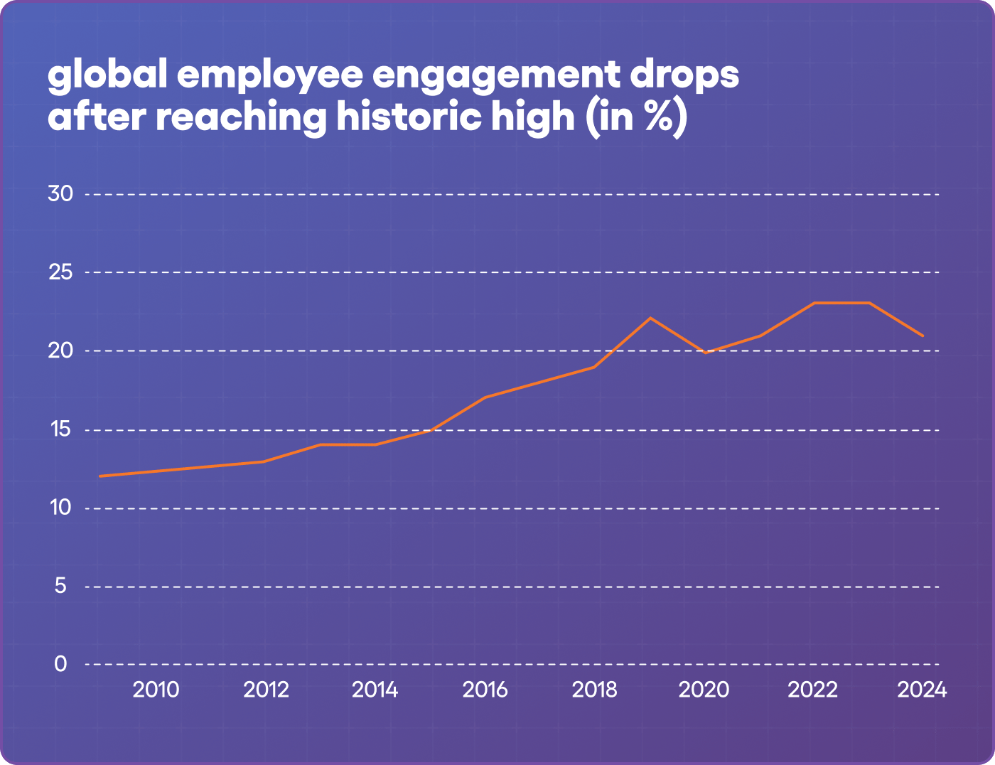 In 2024, the global percentage of engaged employees fell from 23% to 21%. Engagement has only fallen twice in the past 12 years, in 2020 and 2024. Last year's two-point drop in engagement was equal to the decline during the year of COVID-19 lockdowns and shelter-in-place orders.