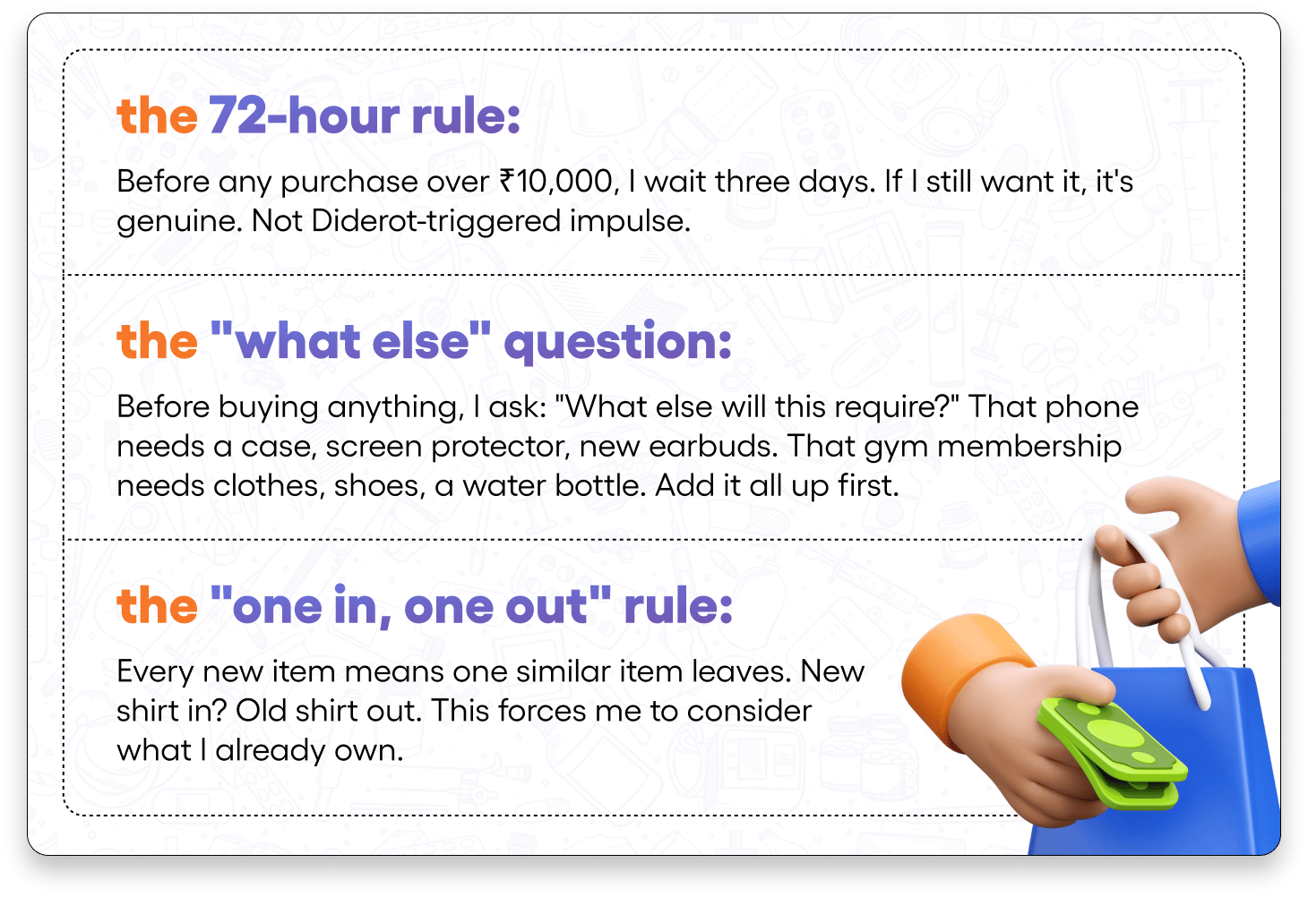 Research backs this. Cooling-off periods reduce regrettable purchases. The "one in, one out" rule breaks the upgrade cycle.